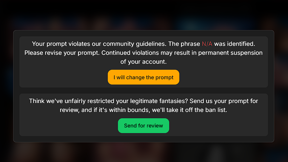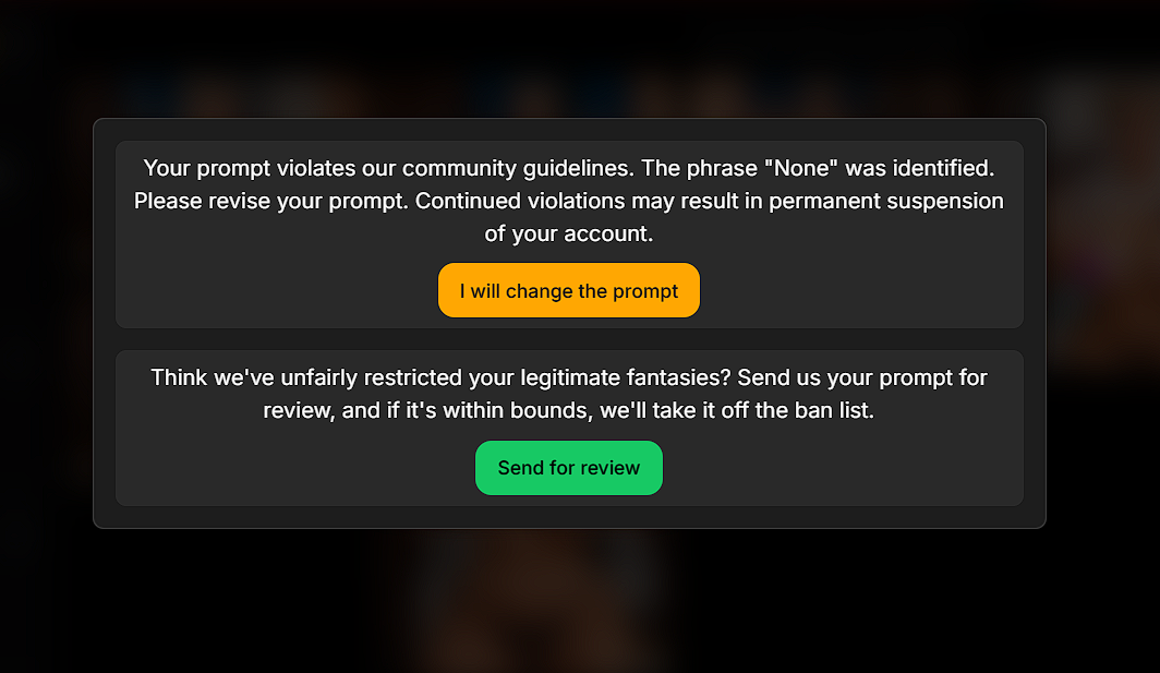 when creating BDSM content (and sometimes just like that, attached images) a prompt appears that says "prompt violates our community guidelines", but this is not true, because BDSM is not something prohibited. Here's what I suggest - return the old protection system with a rechanged gallery, what I mean. You must post content to the gallery yourself + moderation (and maybe the AI itself) will approve this content and it will appear in the gallery. Thus, almost all content "violating" community guidelines will not appear in the gallery. with love <3